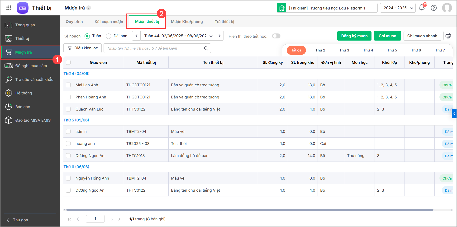 - Tại đây cán bộ thiết bị có thể theo dõi danh sách đăng ký mượn thiết bị của giáo viên.