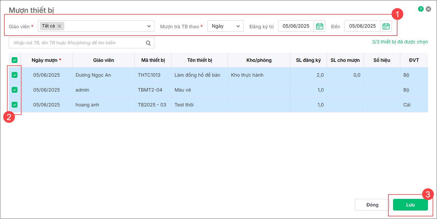 Tích chọn những thiết bị cần ghi mượn, nhấn Lưu.