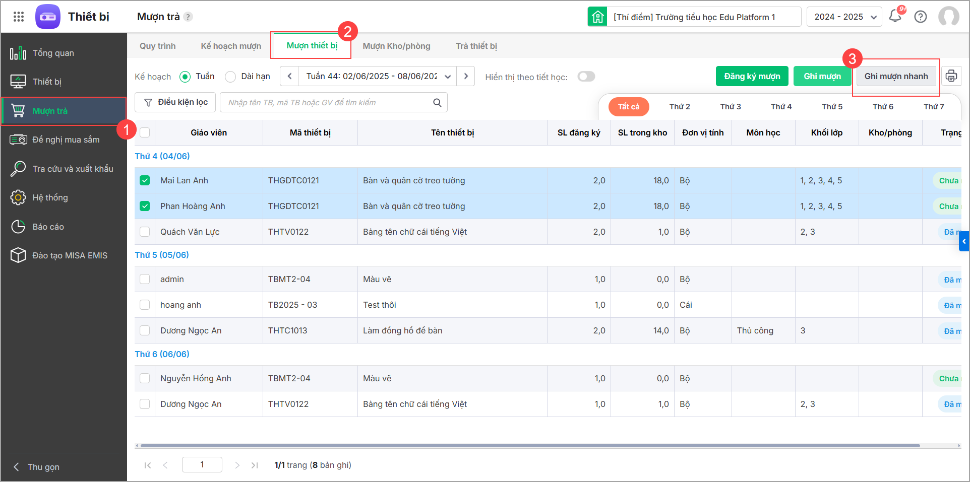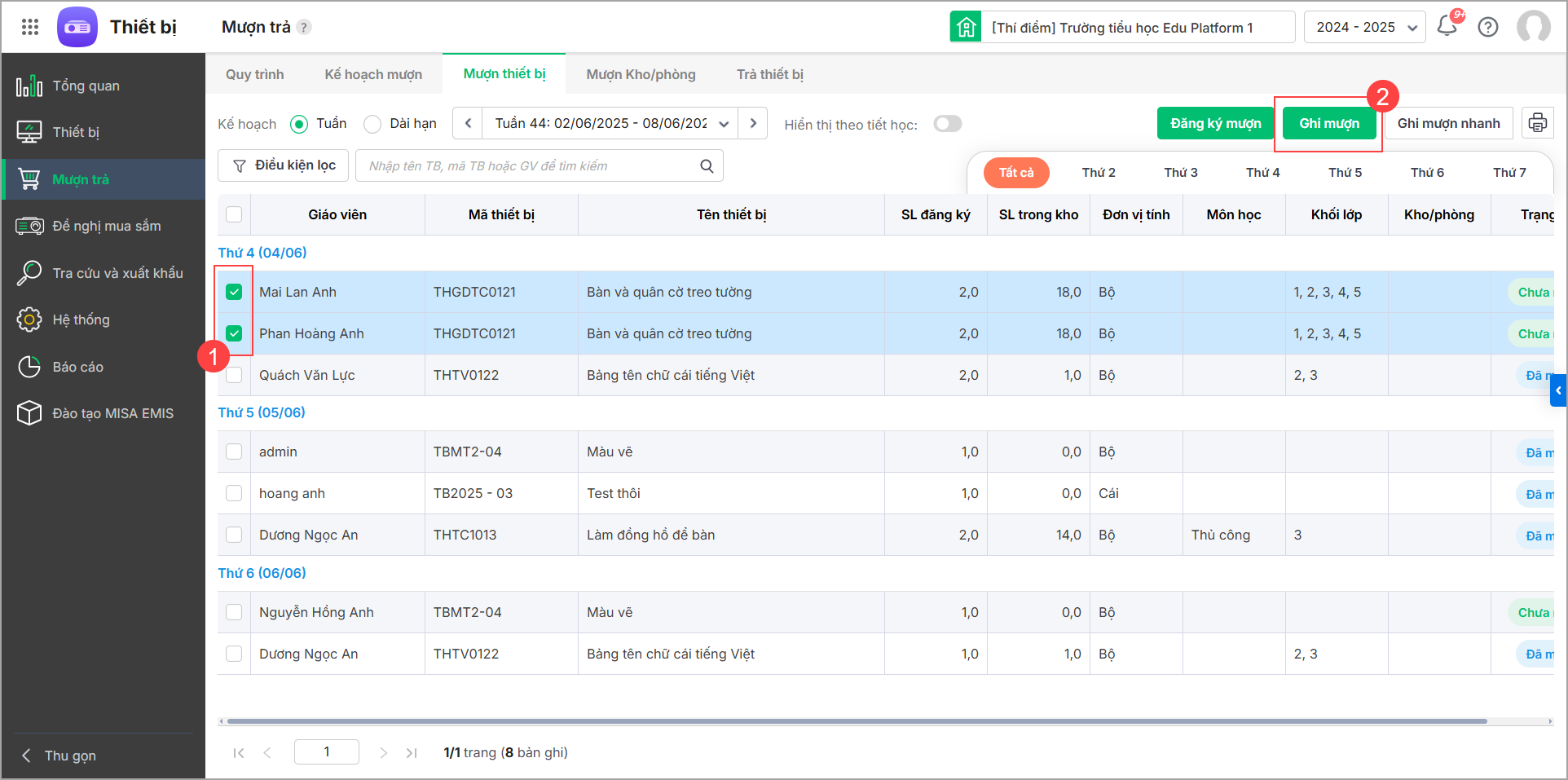 Cán bộ thiết bị tiến hành ghi mượn những thiết bị được giáo viên đăng ký mượn như sau:
