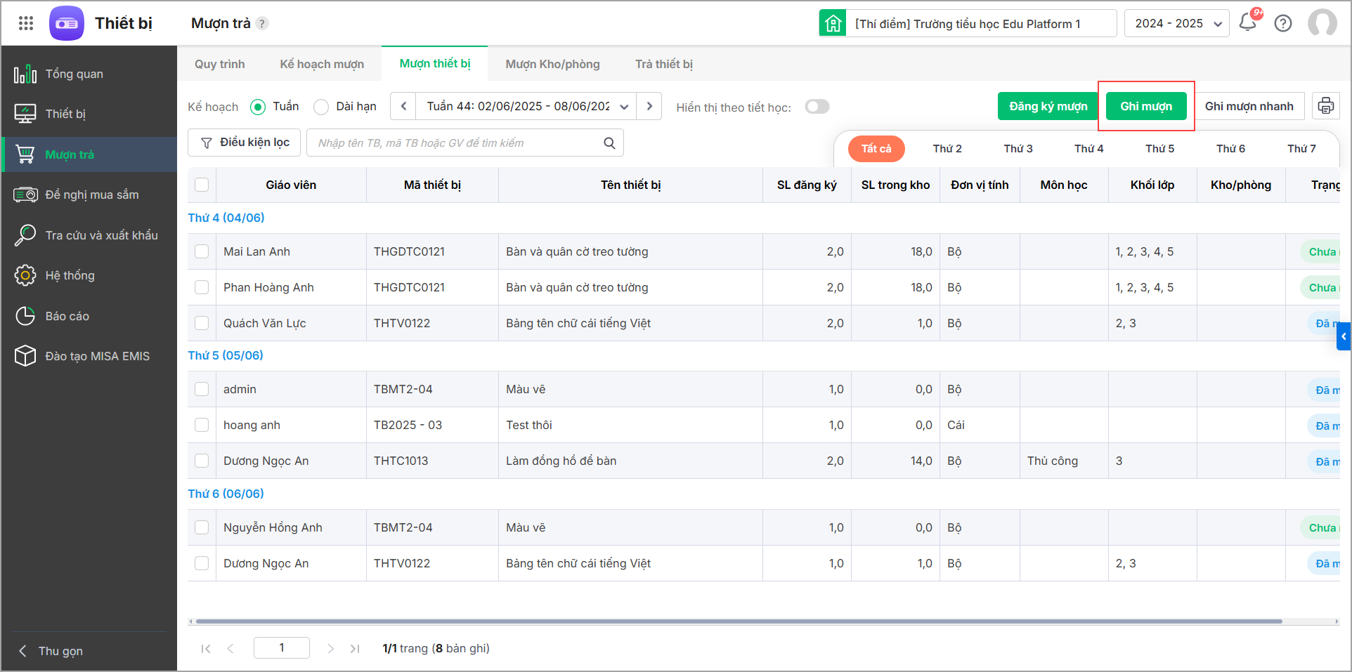 Cán bộ thiết bị tiến hành ghi mượn những thiết bị được giáo viên đăng ký mượn như sau: