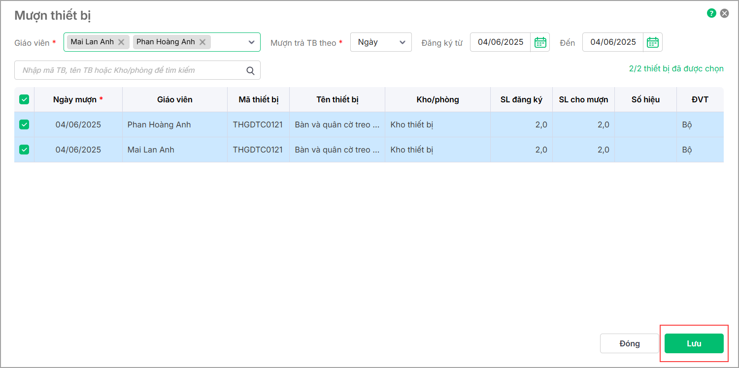 Tích chọn những thiết bị cần ghi mượn, nhấn Lưu.