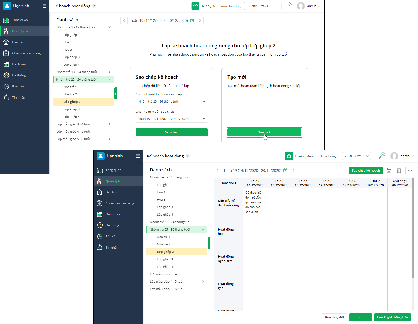 • Vào Quản lý trẻ\Lập kế hoạch tuần