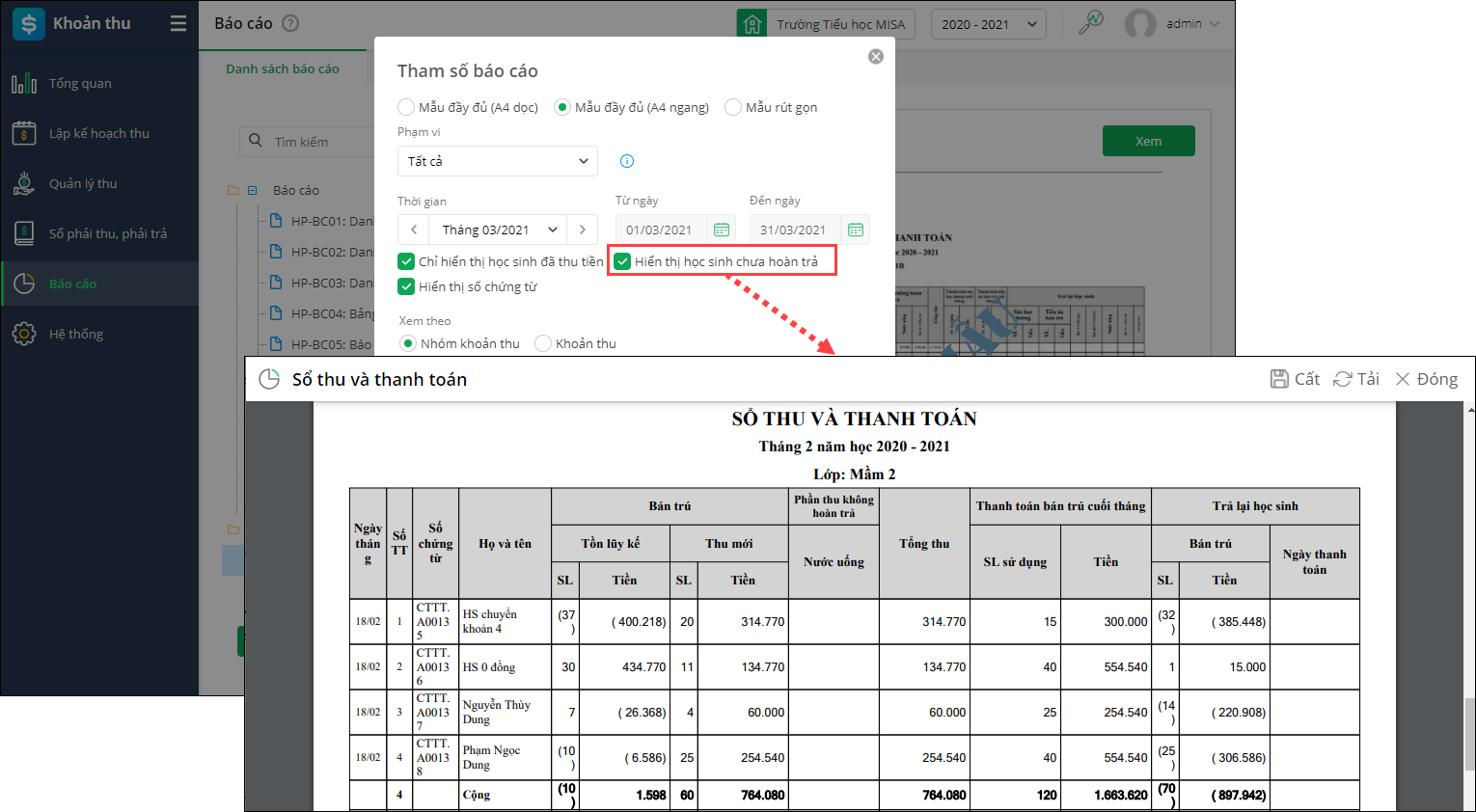 - Từ phiên bản R108: Bổ sung tùy chọn Hiển thị học sinh chưa hoàn trả trên Sổ thu và thanh toán giúp kế toán theo dõi được số buổi ăn, sữa còn tồn của cả những học sinh đã nghỉ học nhưng chưa nhận lại tiền để đối chiếu với tổng quỹ ăn, sữa.