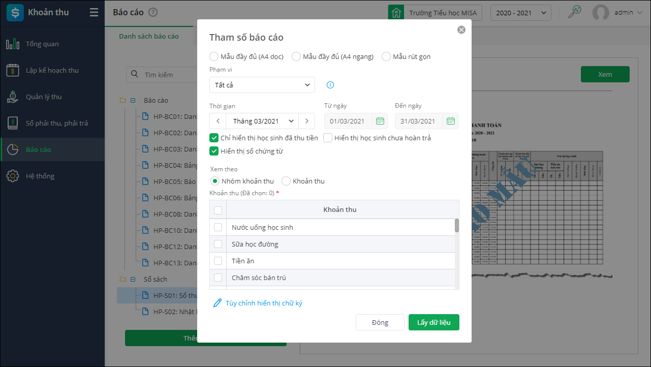 - Vào Khoản thu\Báo cáo\Danh sách báo cáo\HP-S01: Sổ thu và thanh toán