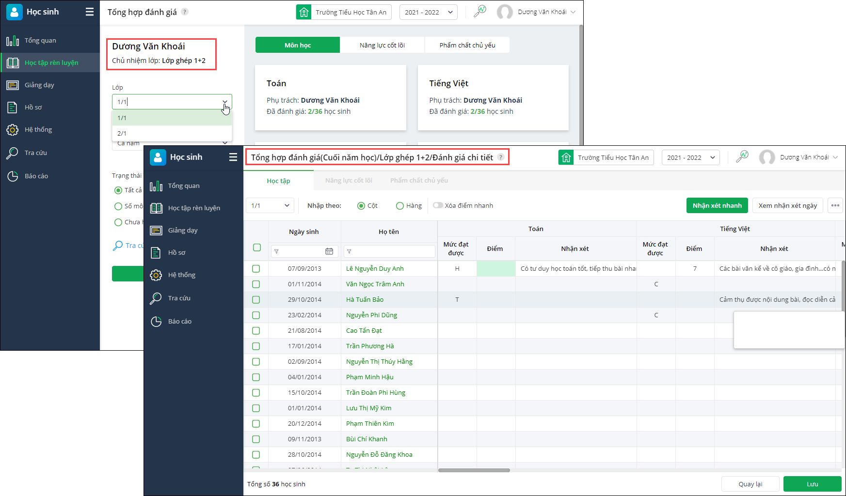 - Từ phiên bản R108: Giáo viên chủ nhiệm cấp Tiểu học có thể dễ dàng thực hiện đánh giá cho các học sinh lớp ghép trong trường