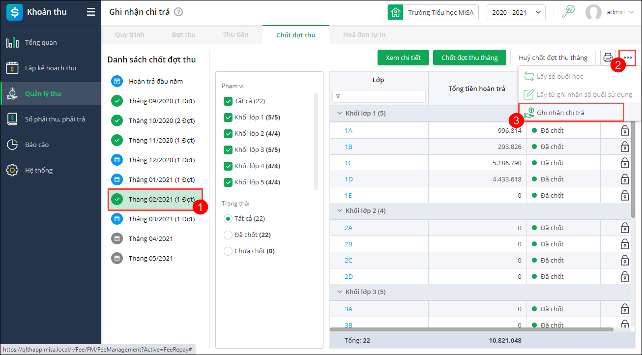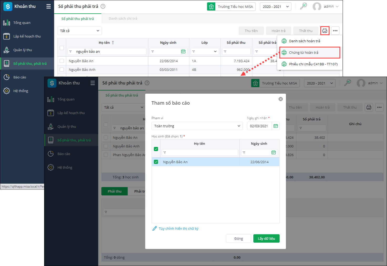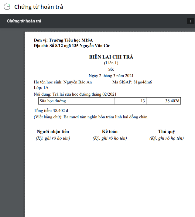 Để in được chứng từ hoàn trả cho học sinh, anh/chị cần ghi nhận khoản thực hiện Ghi nhận chi trả cho học sinh đó.