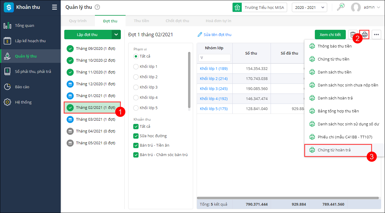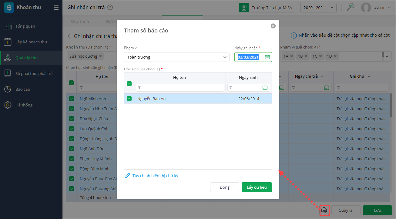 Để in được chứng từ hoàn trả cho học sinh, anh/chị cần ghi nhận khoản thực hiện Ghi nhận chi trả cho học sinh đó.