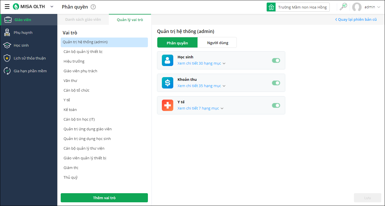 - Chọn mục Quản lý vai trò, tại đây anh/chị có thể dễ dàng phân quyền cho các vai trò có mặt trong trường