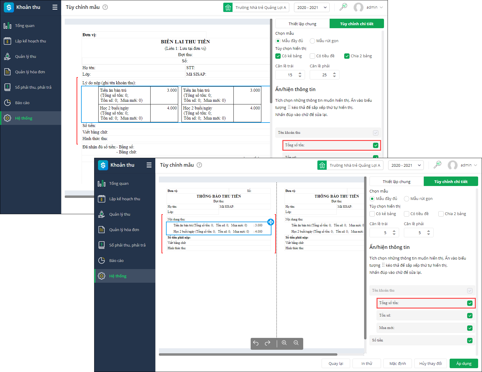 Xem hướng dẫn Tùy chỉnh chứng từ, thông báo thu tiền tại đây.