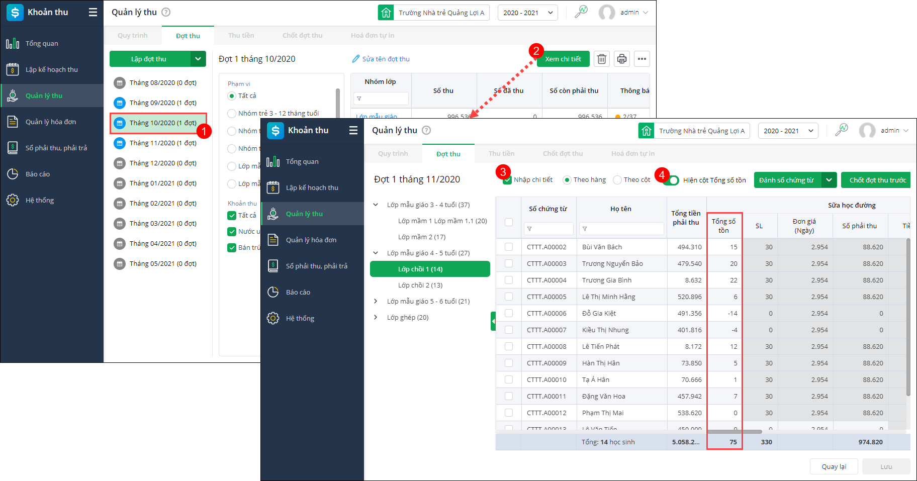 Câu chuyên nghiệp vụ: Tại đơn vị, trường hợp học sinh có số buổi tồn tháng trước > số buổi đăng ký tháng này thì tháng này học sinh không phải nộp tiền khoản thu đó. Đồng thời, trên thông báo thu tiền, báo cáo, sổ sách hiển thị đúng số tồn của tháng trước.