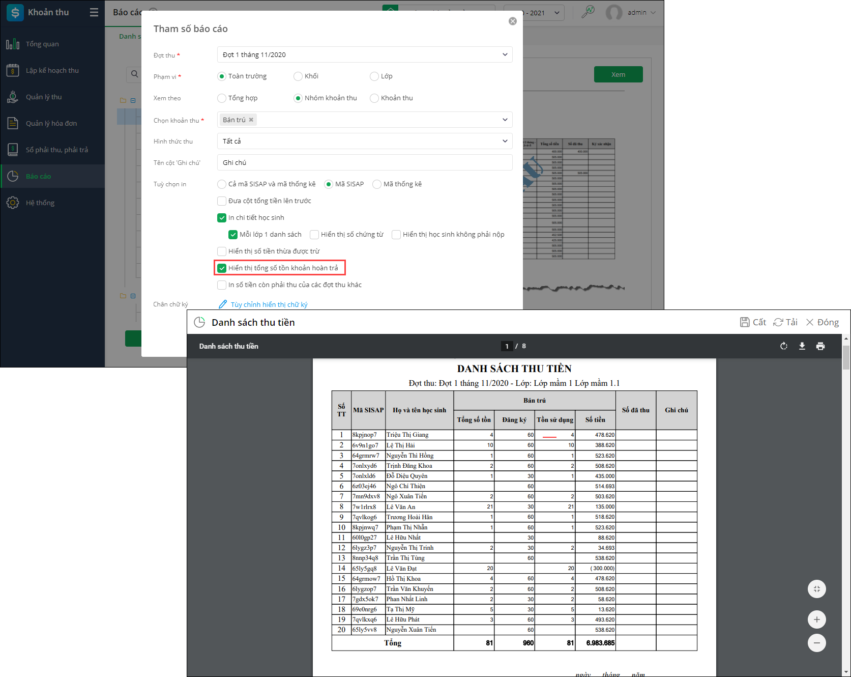 Lưu ý: Để in được danh sách thu tiền có hiển thị Tổng số tồn, anh/chị chọn Xem theo Nhóm khoản thu hoặc Khoản thu