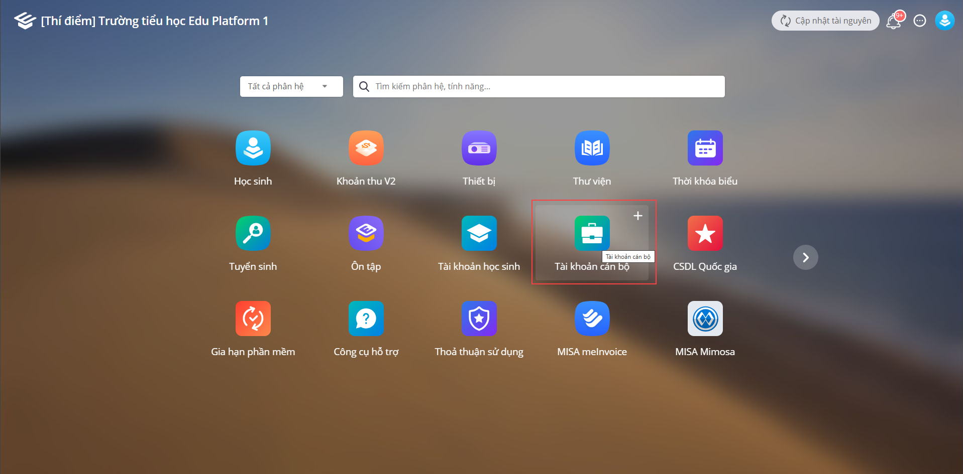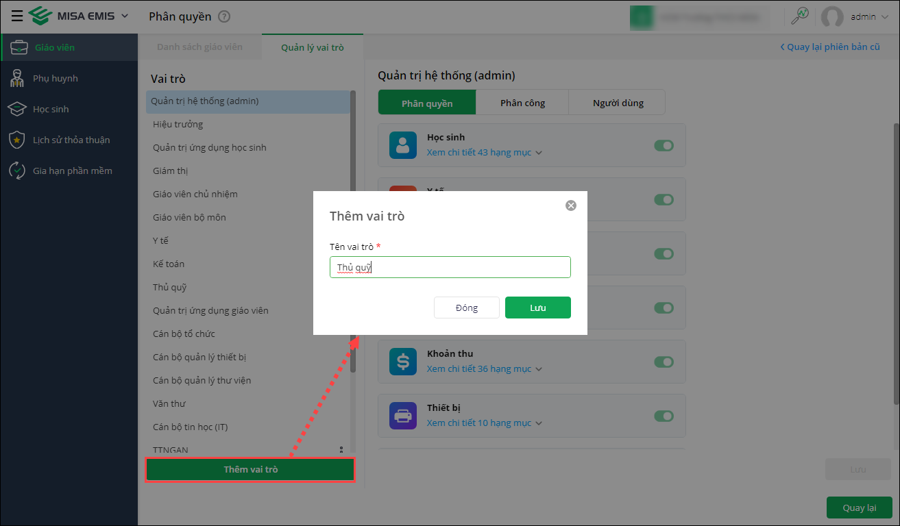 Phần mềm đã mặc định các vai trò thường có tại trường, tuy nhiên có thể thêm mới vai trò, phân quyền hoặc chọn người dùng cho vai trò theo nhu cầu của đơn vị.