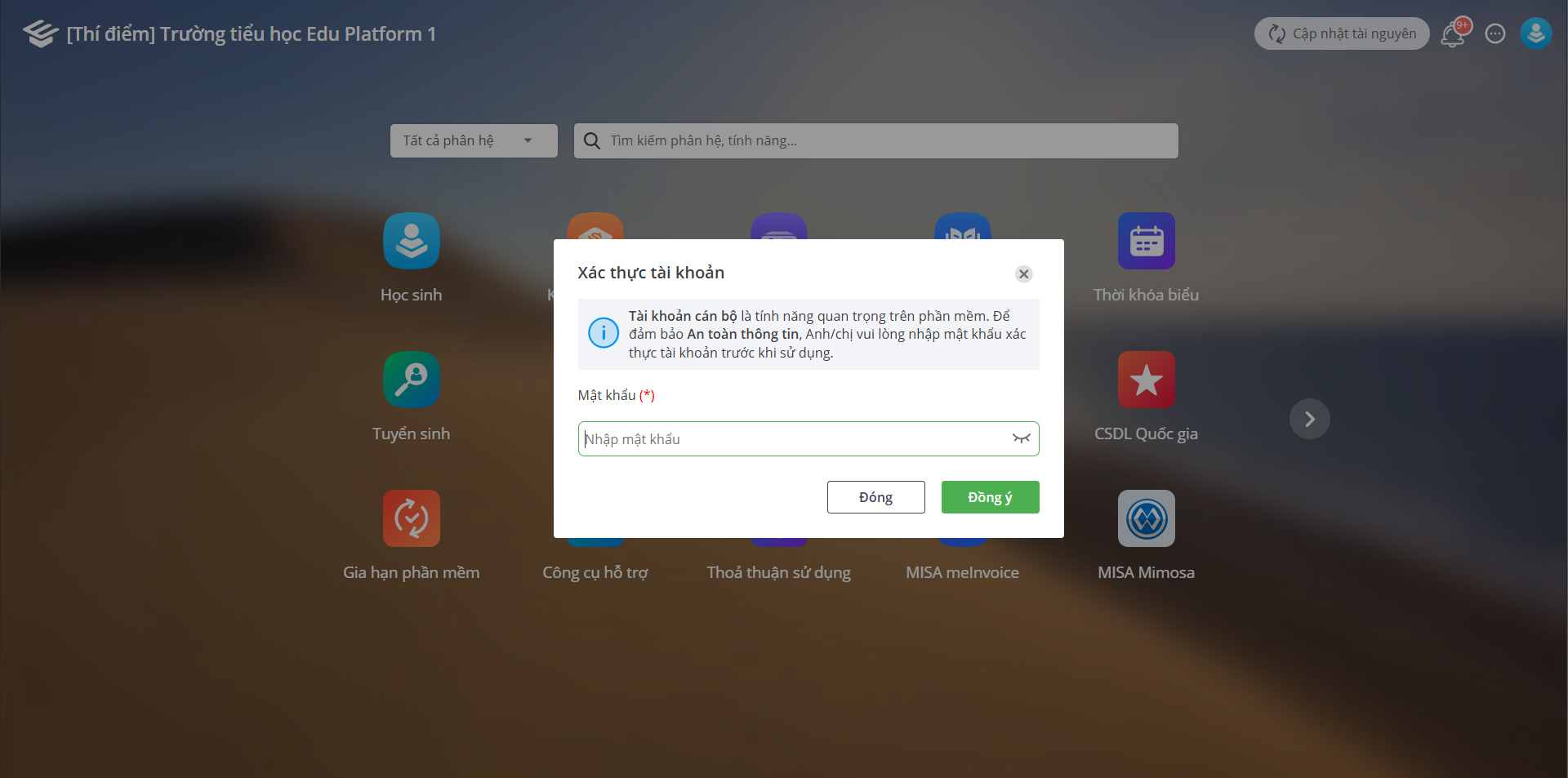 - Anh/chị nhập mật khẩu đang đăng nhập sử dụng phần mềm để xác thực tài khoản, chọn Đồng ý