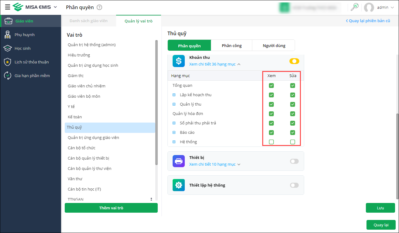 - Phần mềm đã mặc định sẵn các quyền mà vai trò được phép sử dụng trên phần mềm tuy nhiên anh/chị có thể tích chọn hoặc bỏ tích chọn theo đúng thực tế tại đơn vị của mình