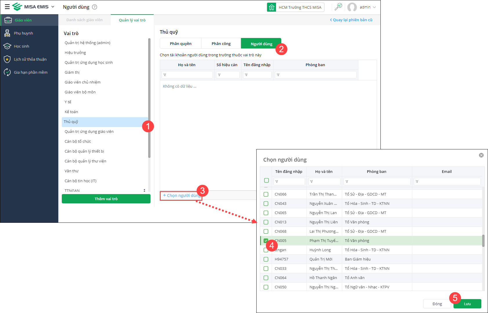 - Chọn tab Người dùng, chọn vai trò trên danh sách.