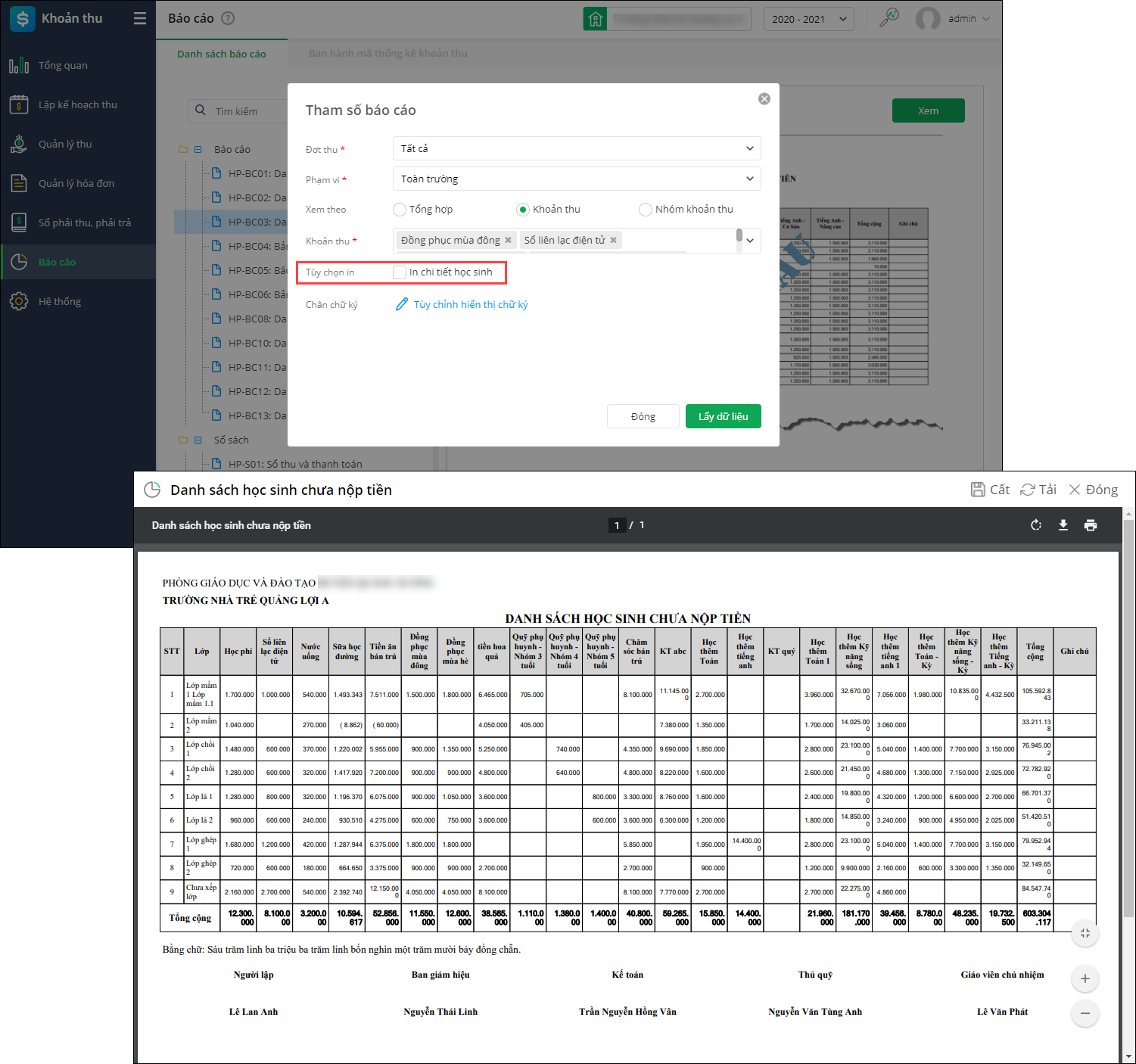 - Vào Báo cáo\HP-BC03: Danh sách học sinh chưa nộp tiền