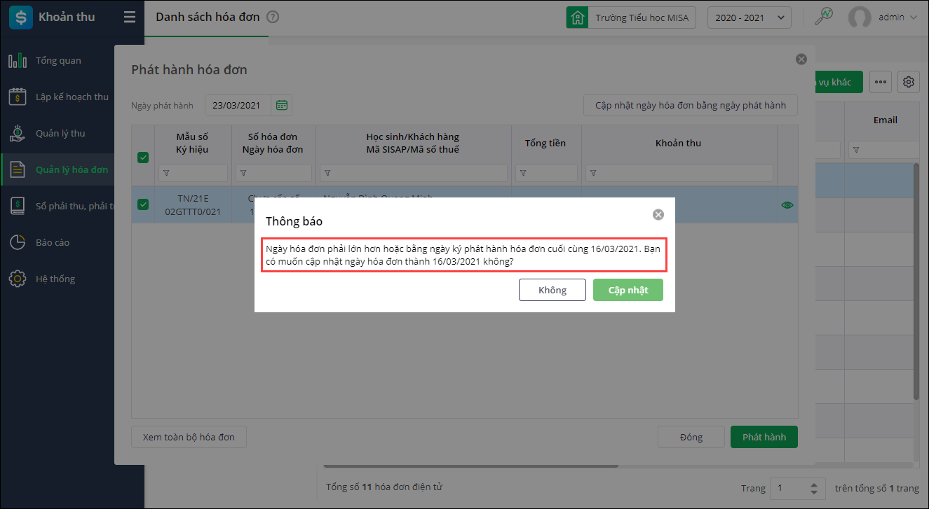 - Với các trường có thiết lập sử dụng Hóa đơn điện tử, vào Quản lý hóa đơn