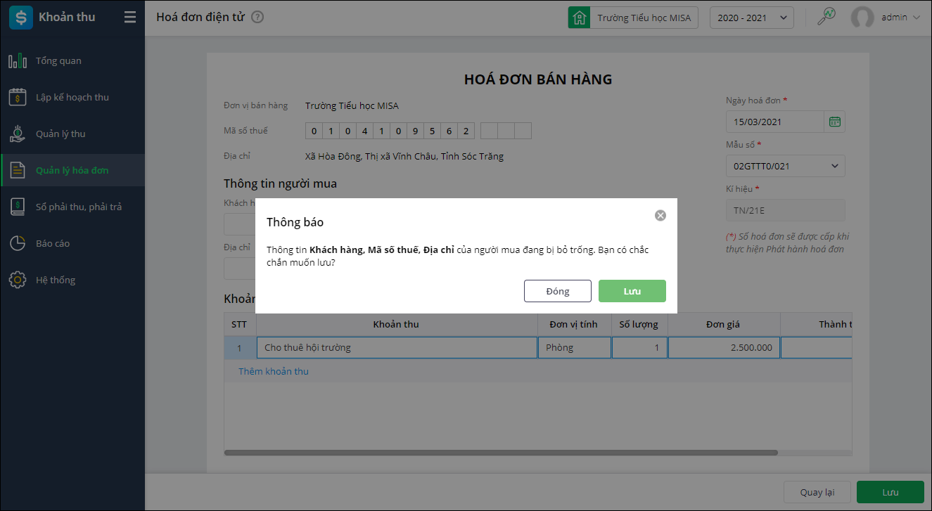 - Tại trường có thiết lập sử dụng Hóa đơn điện tử