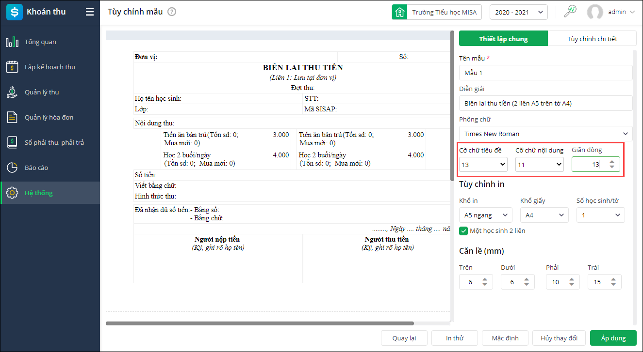 - Nhấn Áp dụng để sử dụng chứng từ vừa thực hiện tùy chỉnh