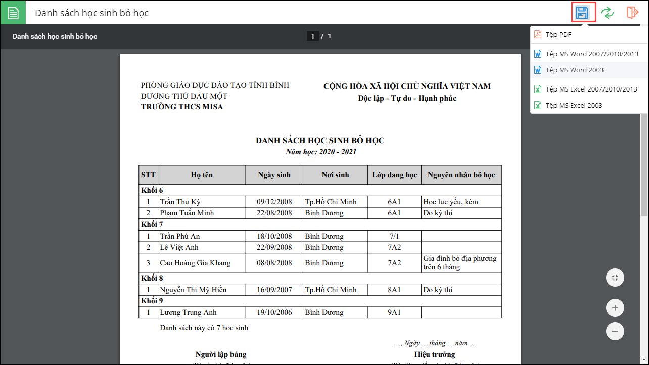 - Từ phiên bản R109: Bổ sung mẫu báo cáo Danh sách học sinh bỏ học và Danh sách học sinh đi học trở lại giúp nhà trường kiểm soát biến động của học sinh.