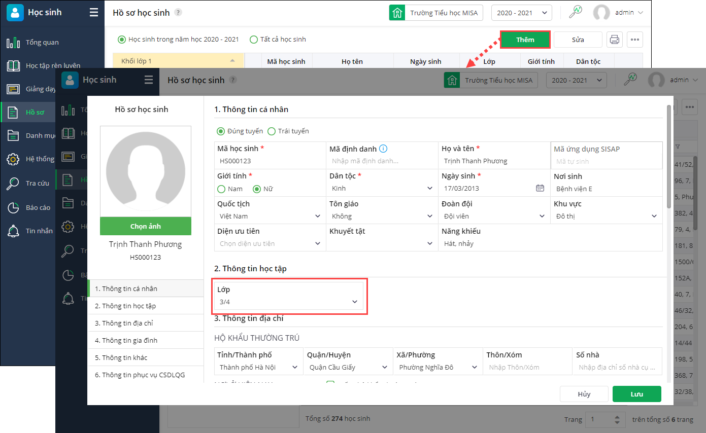1. Khi thực hiện Thêm hồ sơ học sinh, cho phép khai báo thông tin lớp của học sinh đó.