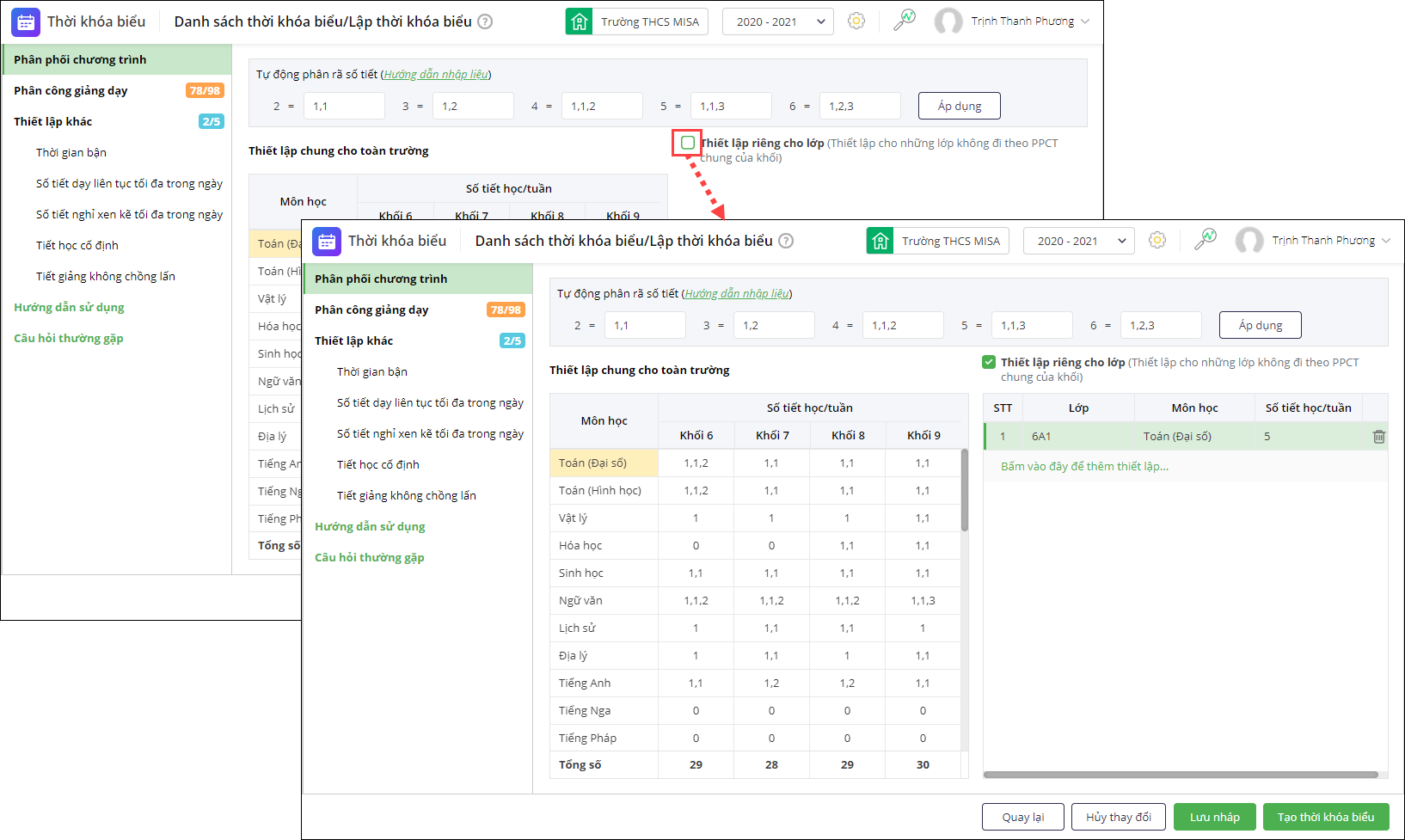 1. Trường hợp có lớp học có phân phối chương trình khác với toàn trường, anh/chị thực hiện Thiết lập riêng cho lớp đó.