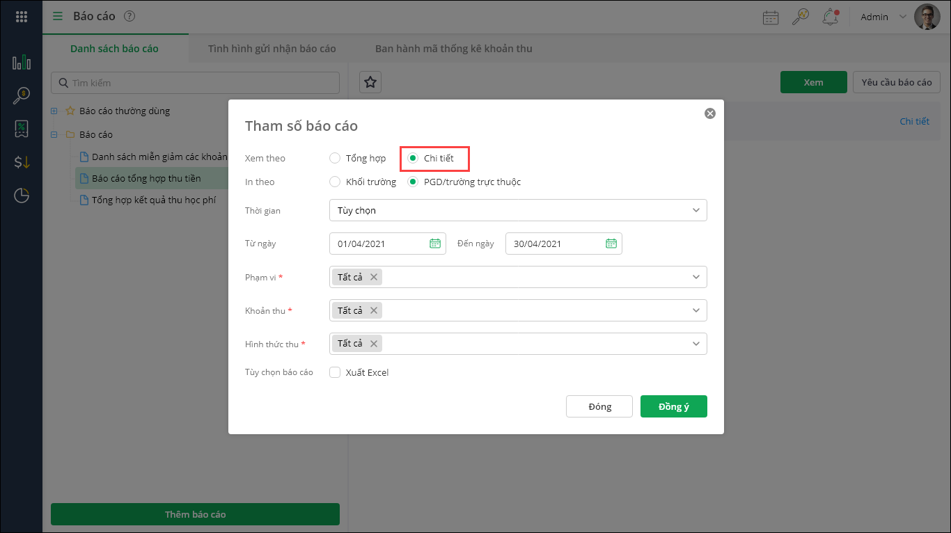 • Chọn thời gian, Ngày in,phạm vi, khoản thu, hình thức thu