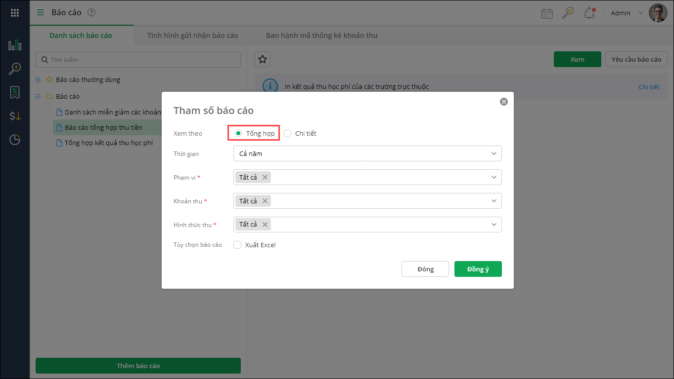• Tổng hợp: khai báo các tham số thời gian, phạm vi, khoản thu, hình thức thu