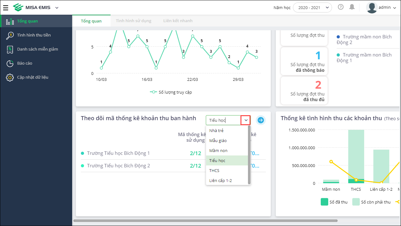- Tại màn hình Tổng quan, PGD/SGD dễ dàng Theo dõi mã thống kê Khoản thu đã ban hành.
