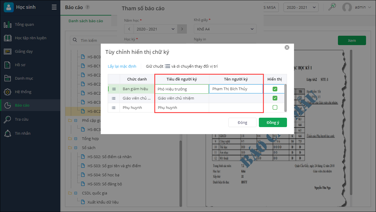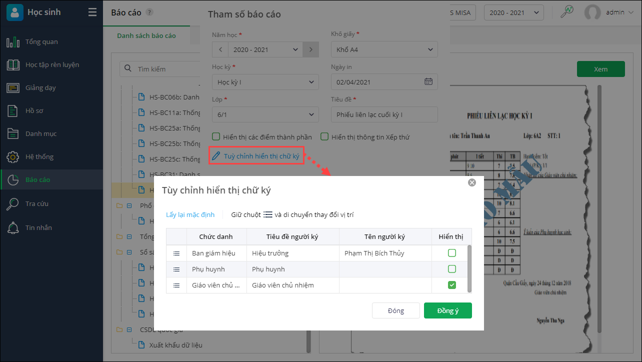- Tùy chỉnh chân chữ ký phiếu liên lạc phù hợp với đơn vị