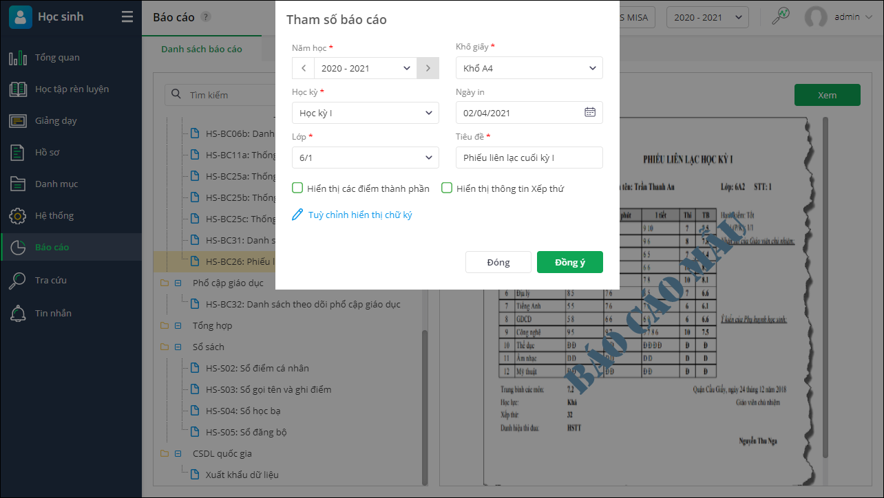 - Chọn Học sinh\Báo cáo\Báo cáo\HS-BC26: Phiếu liên lạc