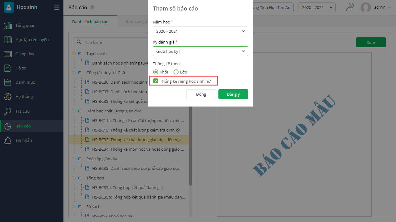 - Vào Báo cáo/Đảm bảo chất lượng giáo dục/HS-BC 33: Thống kê chất lượng giáo dục tiểu học