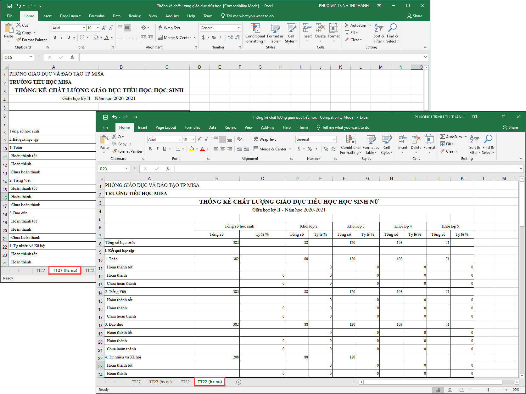 - Từ phiên bản R110: Bổ sung tùy chọn Thống kê riêng cho học sinh nữ trên báo cáo Thống kê chất lượng giáo dục tiểu học, giúp BGH thống kê kết quả học tập tất cả các môn của học sinh nữ để theo dõi chất lượng của nhóm học sinh này.