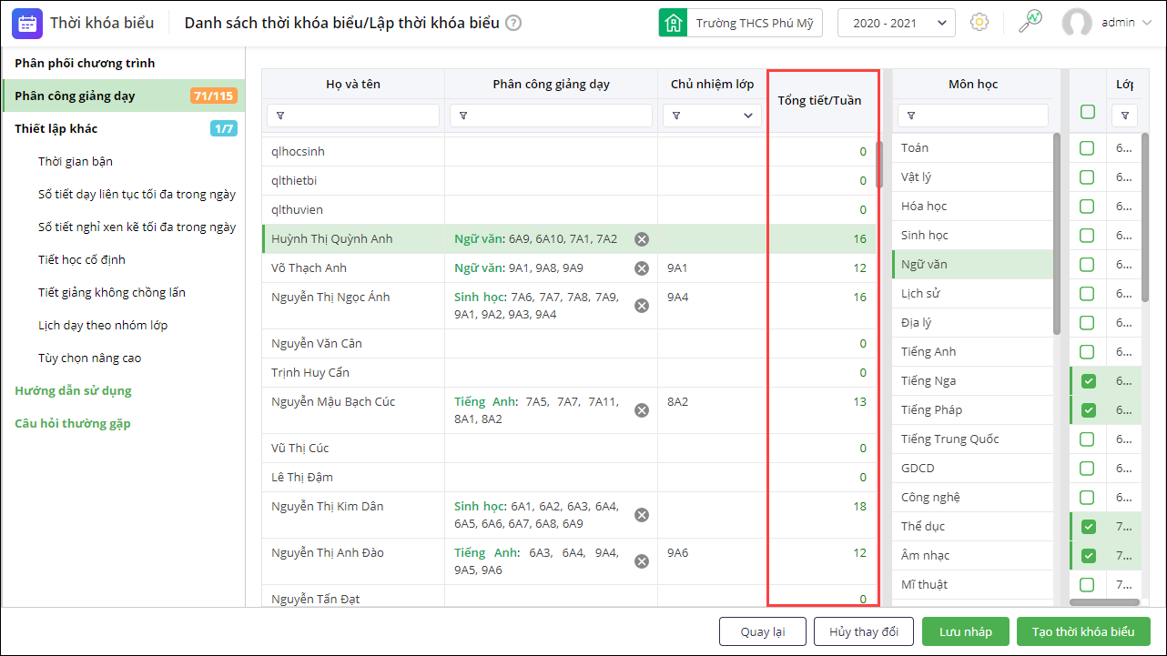 - Trước phiên bản R110: Khi lập thời khóa biểu, giáo vụ thực hiện phân công giảng dạy cho giáo viên theo số tiết quy định sao cho số tiết được phân công không lớn hơn số tiết dạy tối đa. Tuy nhiên phần mềm không hiển thị số tiết đã phân công khiến giáo vụ phân công giảng dạy cho giáo viên nhiều hơn tổng số tiết học trong tuần, dẫn đến không lập được thời khóa biểu.