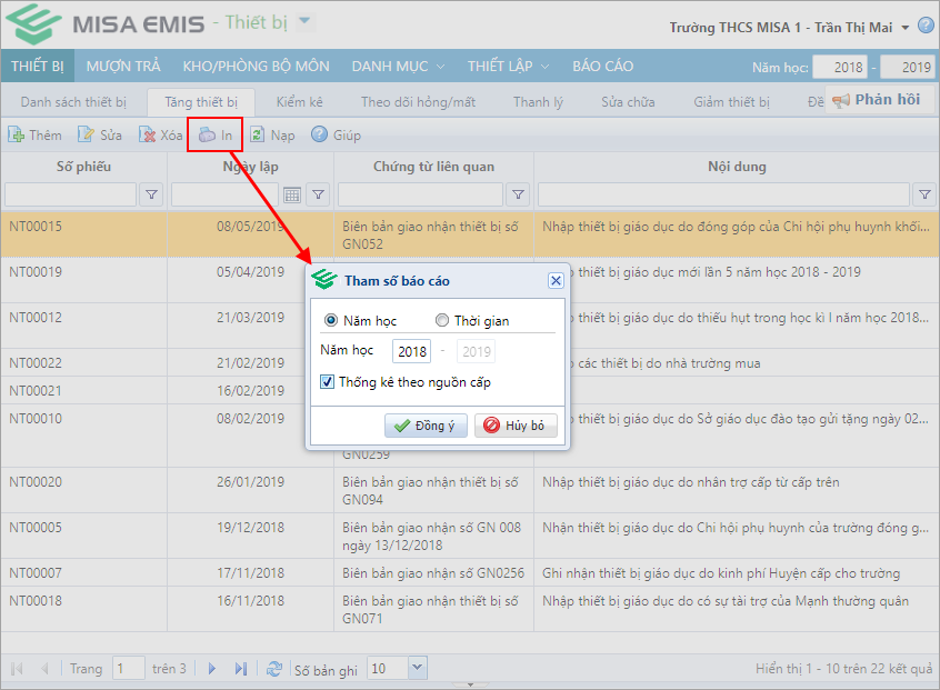 Sau khi thực hiện ghi tăng thiết bị giáo dục, cán bộ quản lý thiết bị có thể in Sổ theo dõi việc tăng thiết bị giáo dục để kiểm tra: