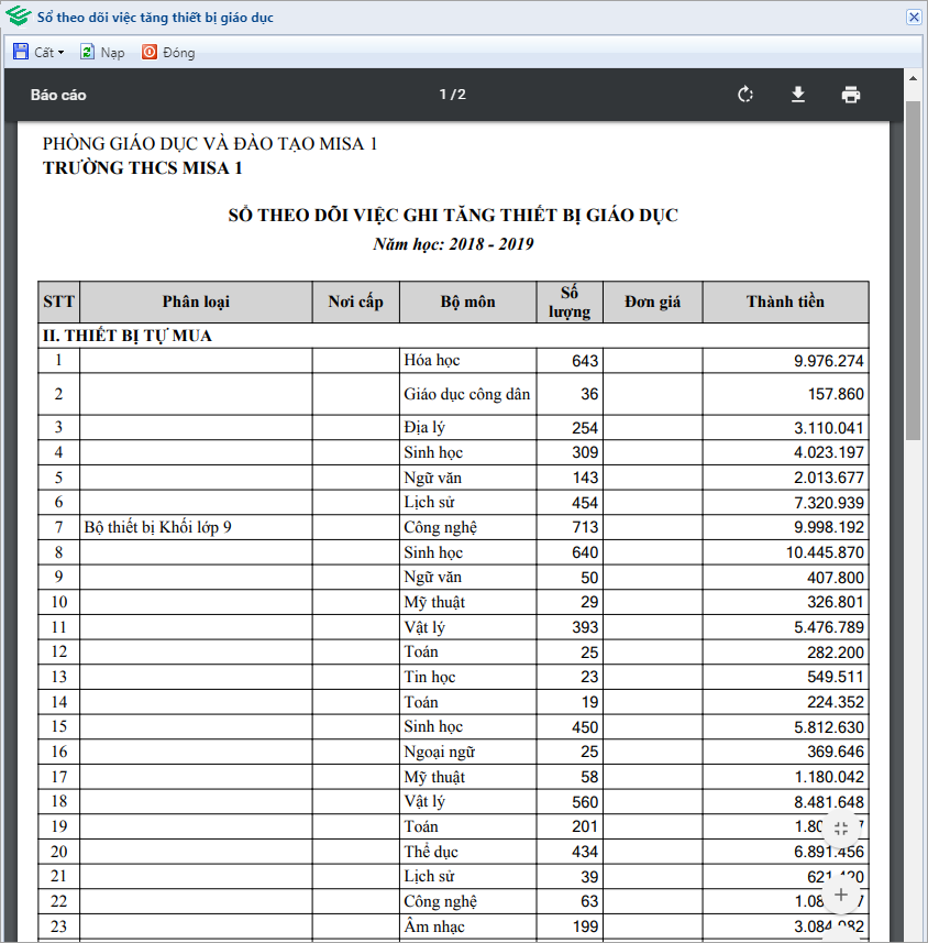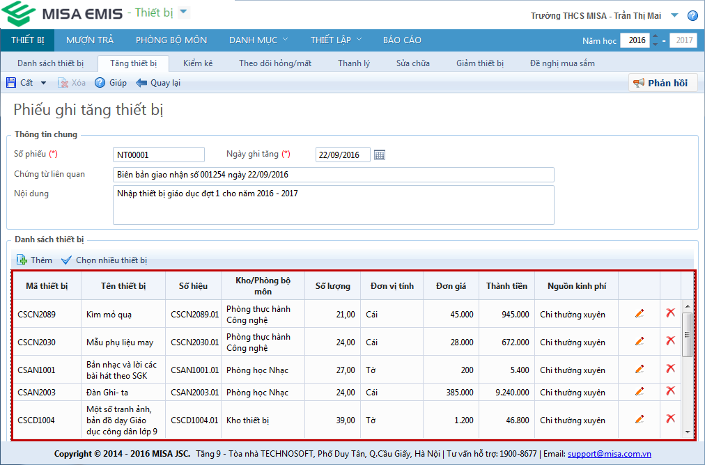 Cho phép ghi nhận các thiết bị giáo dục được đưa vào sử dụng và in Sổ theo dõi việc tăng thiết bị giáo dục.