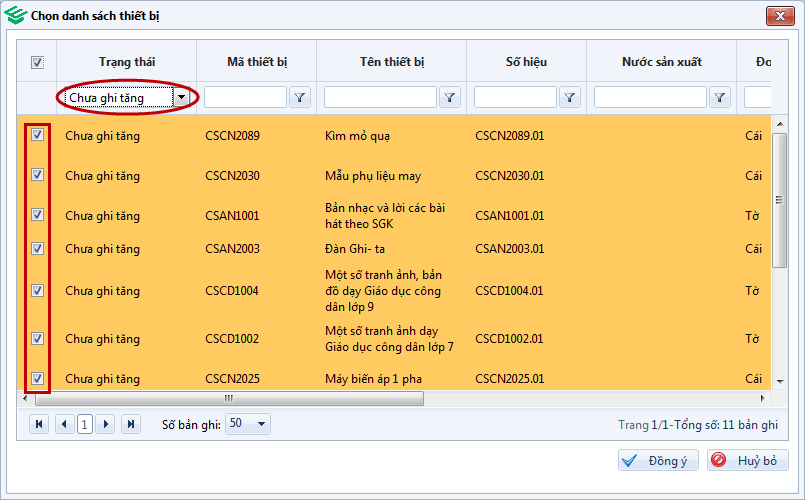 1. Chọn phiếu ghi tăng thiết bị trên danh sách