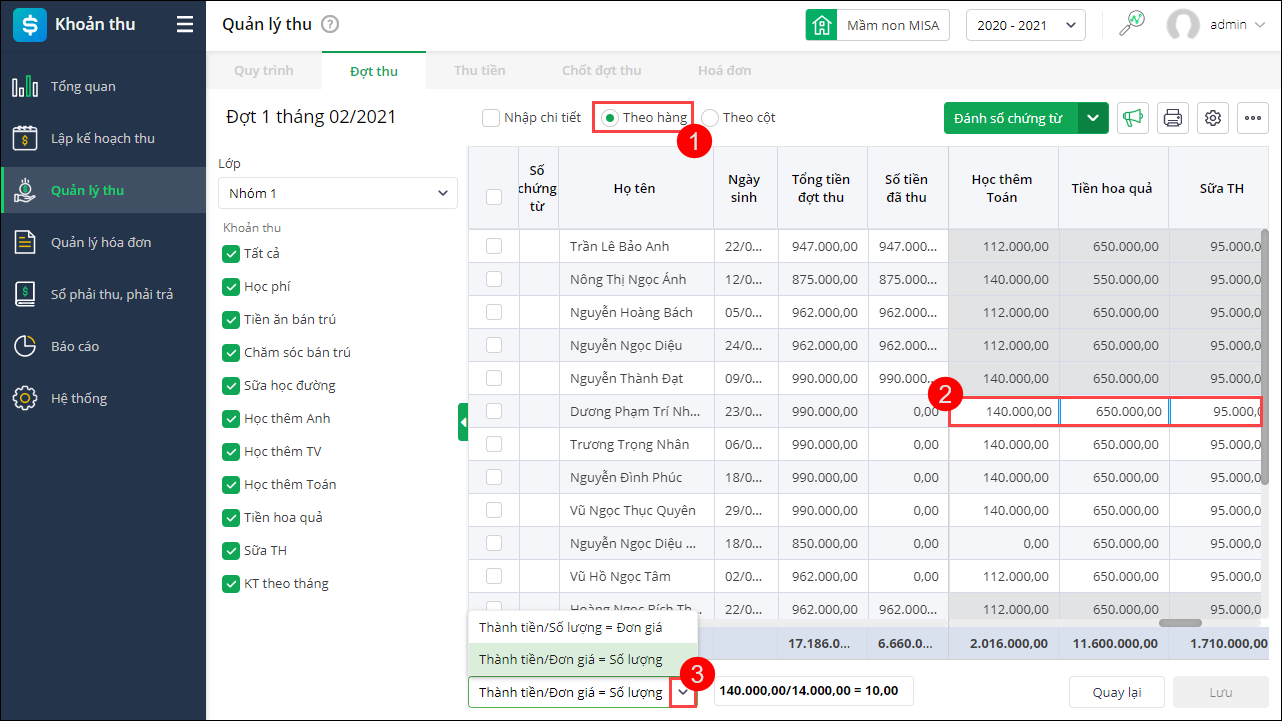- Trường hợp thay đổi số tiền phải thu theo từng học sinh, chọn nhập Theo hàng