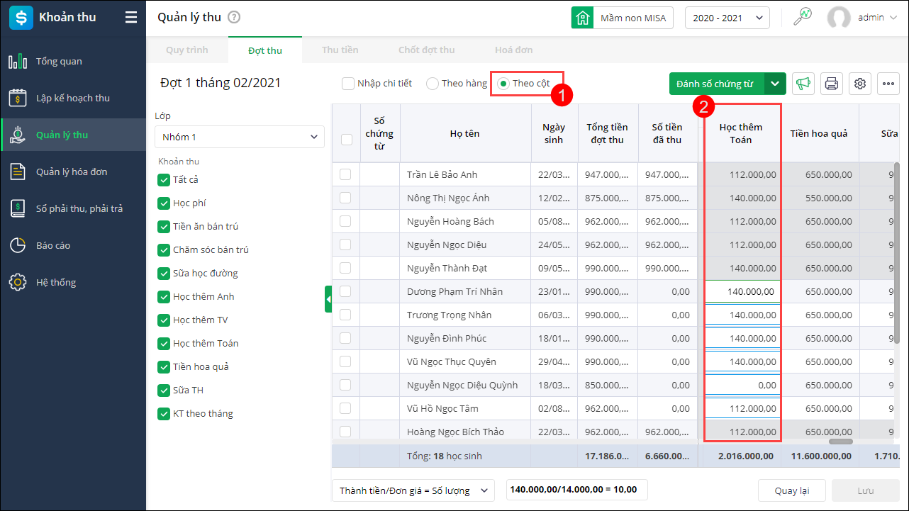 - Trường hợp thay đổi số tiền phải thu theo từng khoản thu cho nhóm học sinh/cả lớp, anh/chị chọn nhập Theo cột.