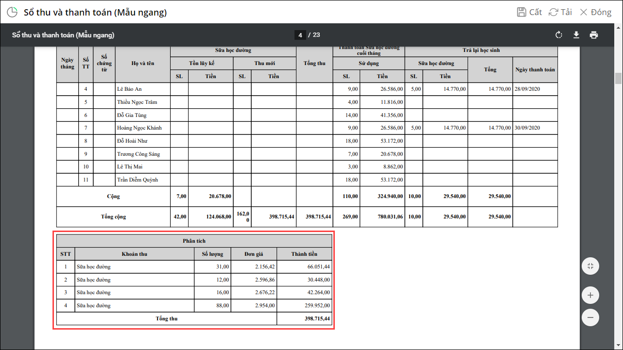 5. Nhấn Lấy dữ liệu, kiểm tra số liệu trên báo cáo. Tại vùng phân tích của báo cáo tách biệt được số buổi sữa của học sinh phải nộp tiền và học sinh được miễn giảm, giúp kế toán dễ dàng đối chiếu với nhà cung cấp