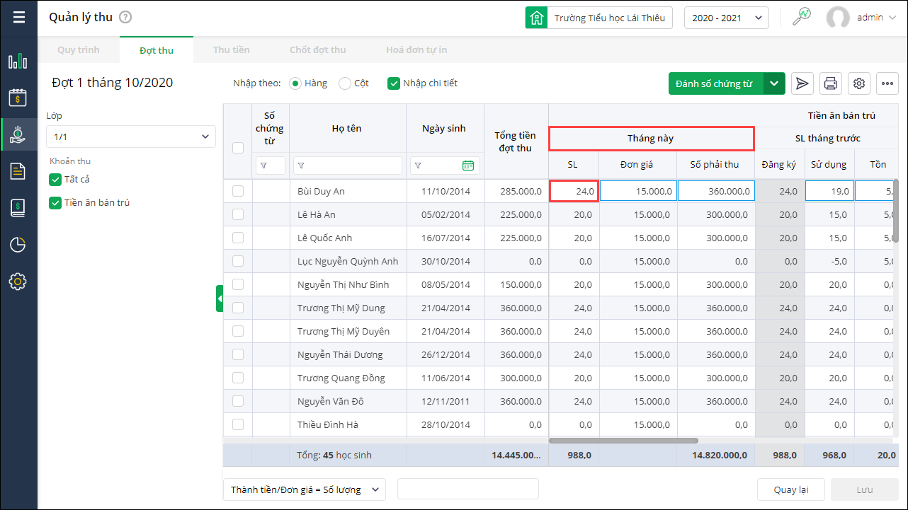 - Trường hợp thay đổi số buổi ăn thực tế/hoàn trả theo từng khoản thu cho nhóm học sinh/cả lớp, anh/chị chọn nhập Theo cột.