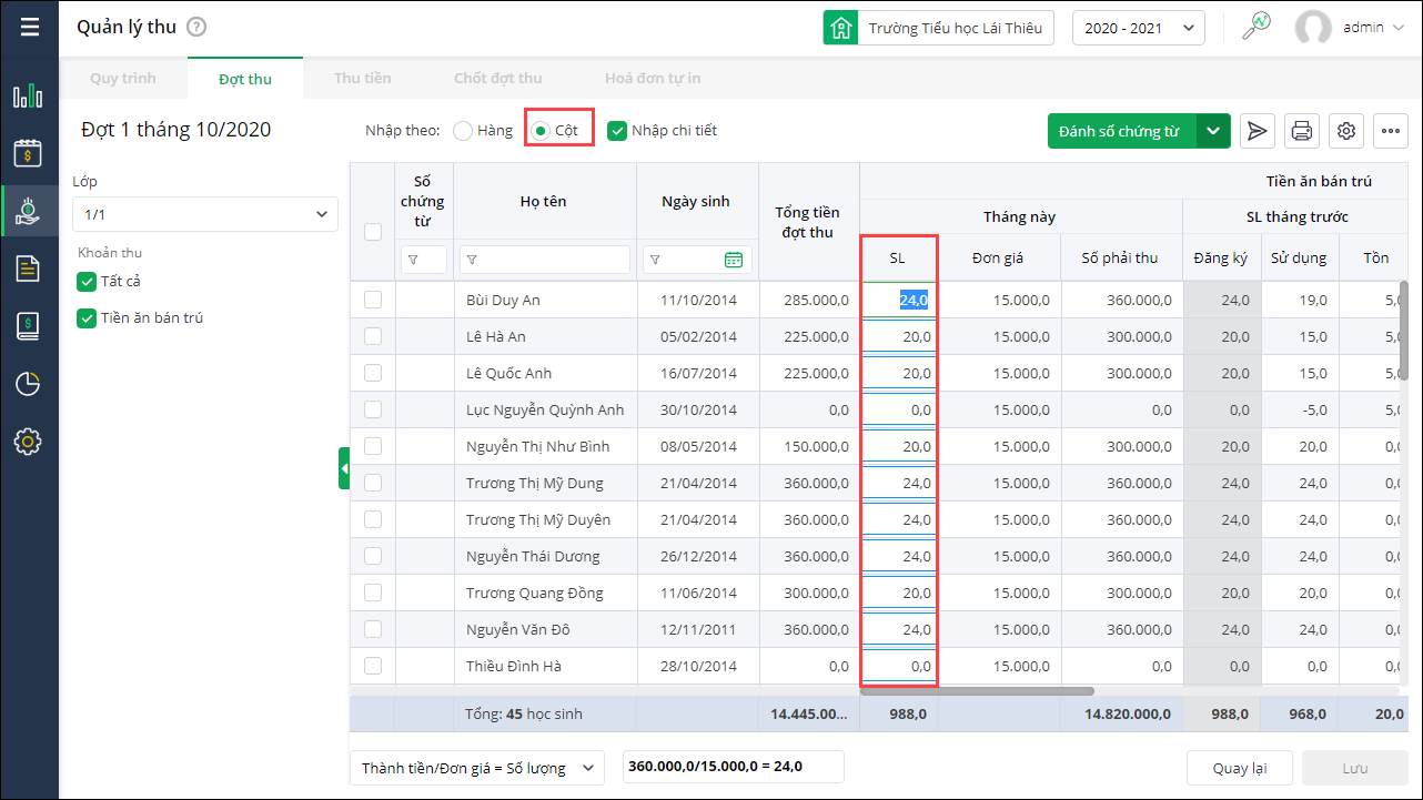 • Trường hợp thay đổi số buổi ăn thực tế/hoàn trả theo từng khoản thu cho nhóm học sinh/cả lớp, anh/chị chọn nhập Theo cột.