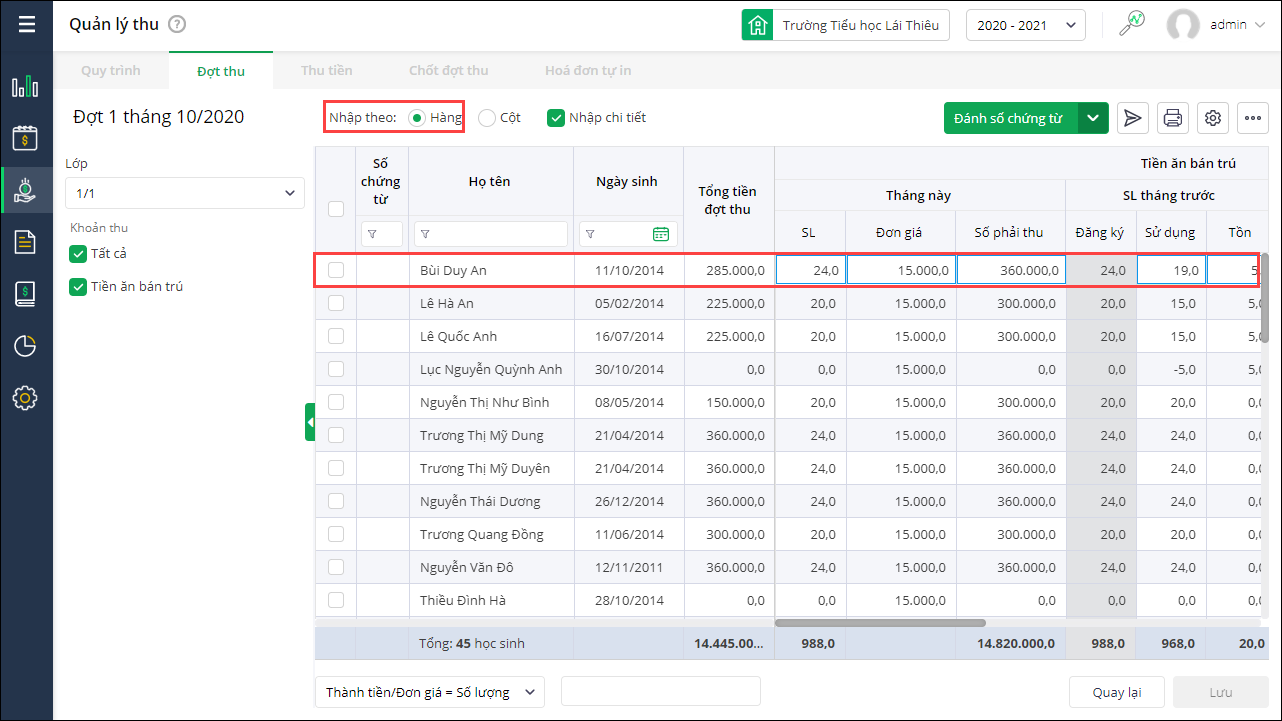 • Trường hợp thay đổi số buổi ăn thực tế/hoàn trả theo từng học sinh, chọn nhập Theo hàng