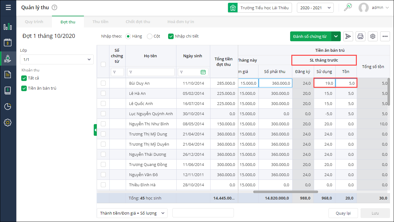 5. Kế toán mong muốn nhanh chóng chuyển số buổi ăn thừa tháng trước sang nhiều tháng sau
