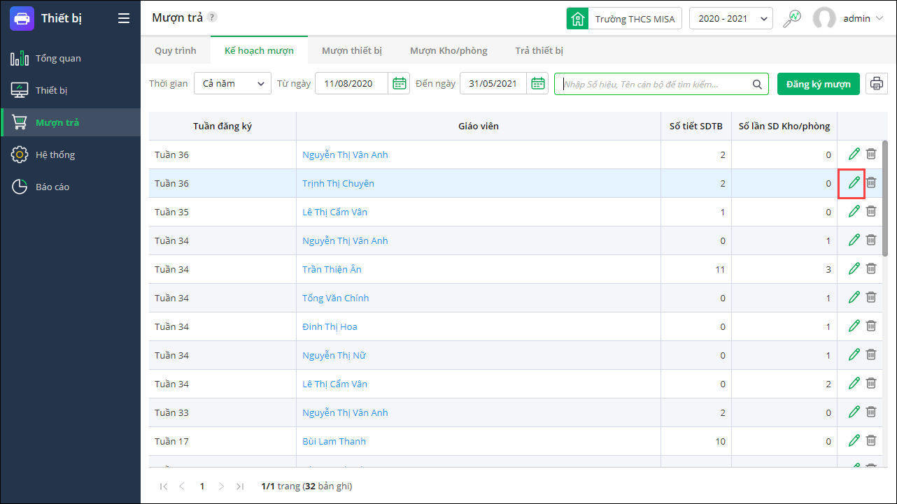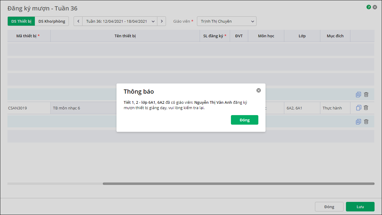 - Khi giáo viên đăng ký mượn thiết bị trùng tiết day, lớp dạy với giáo viên khác trước đó, phần mềm hiển thị cảnh báo: