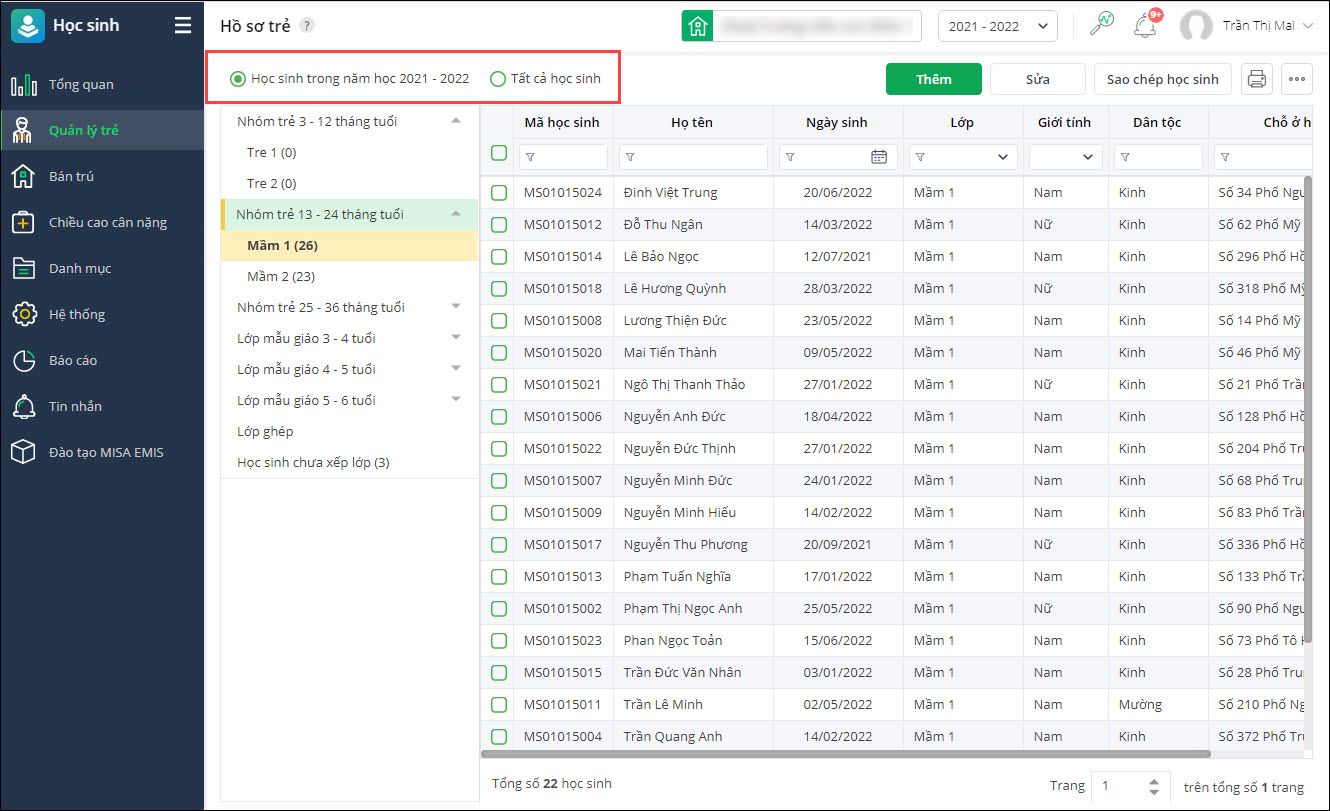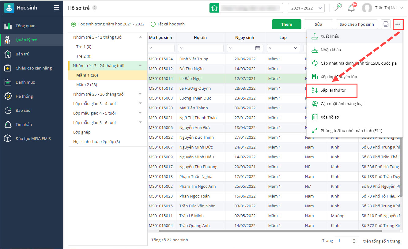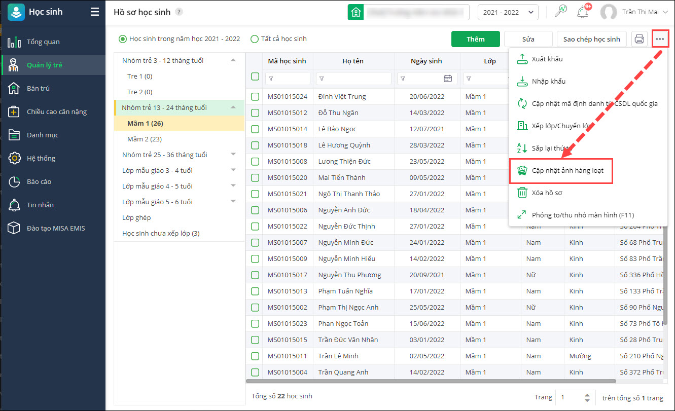 - Tại phân hệ Học sinh\Quản lý trẻ\Hồ sơ trẻ.
