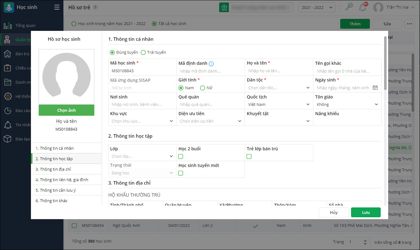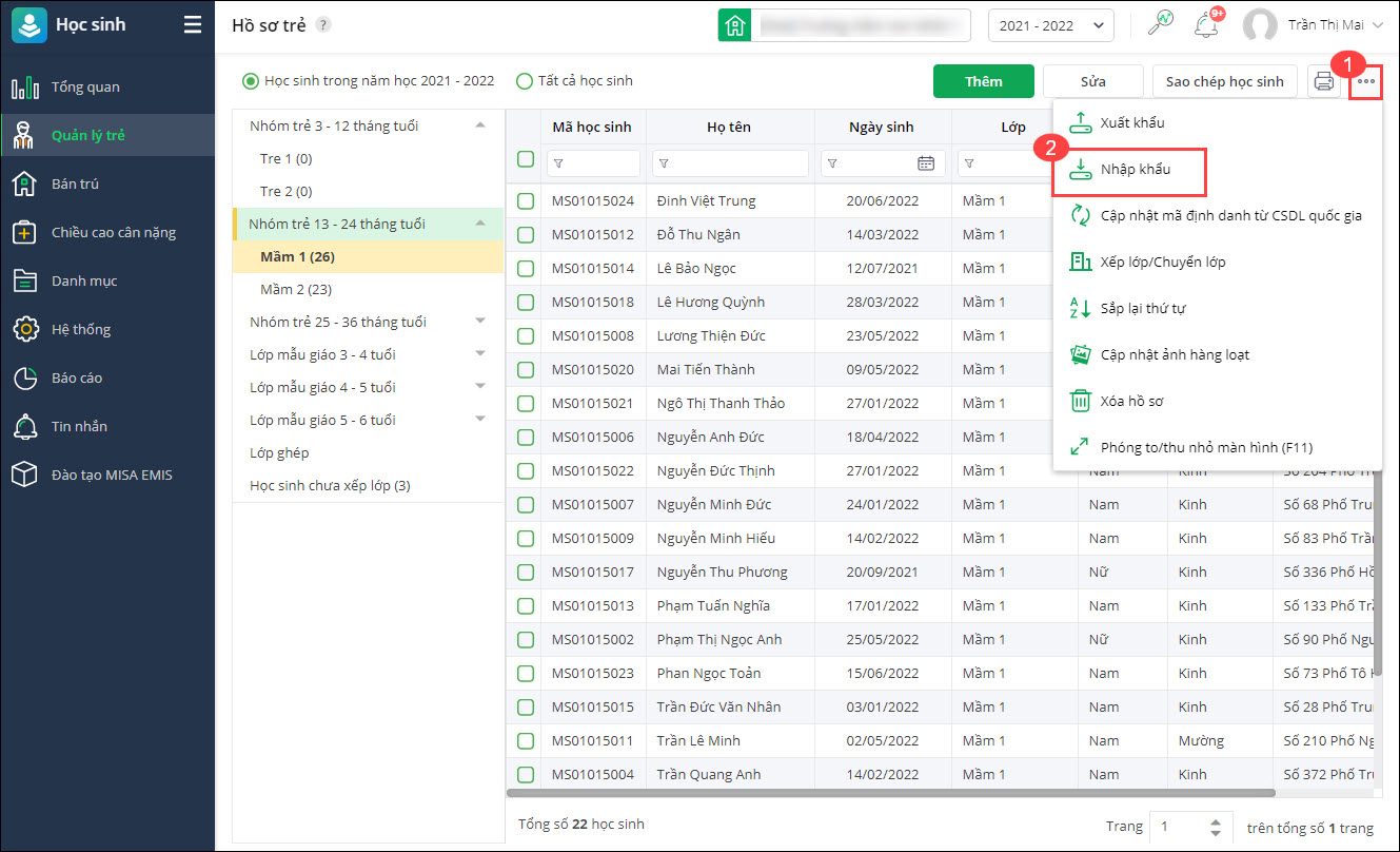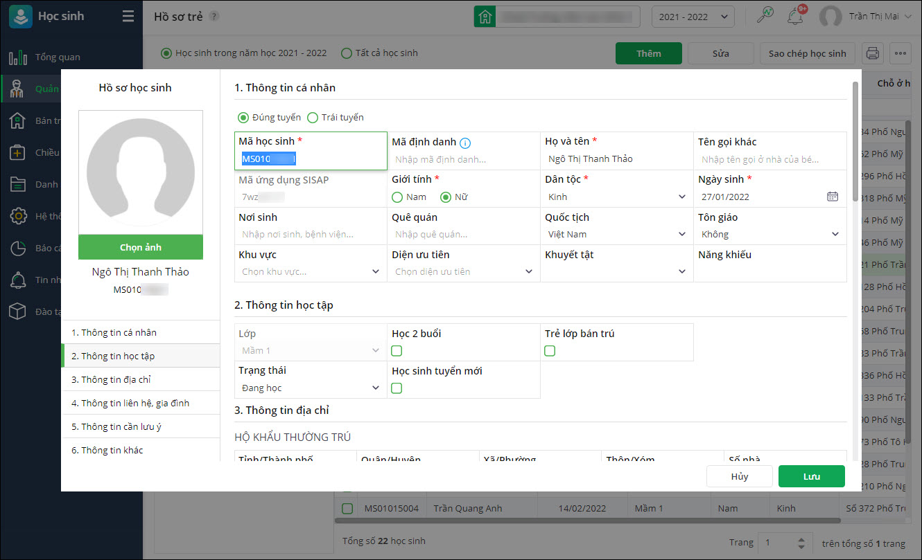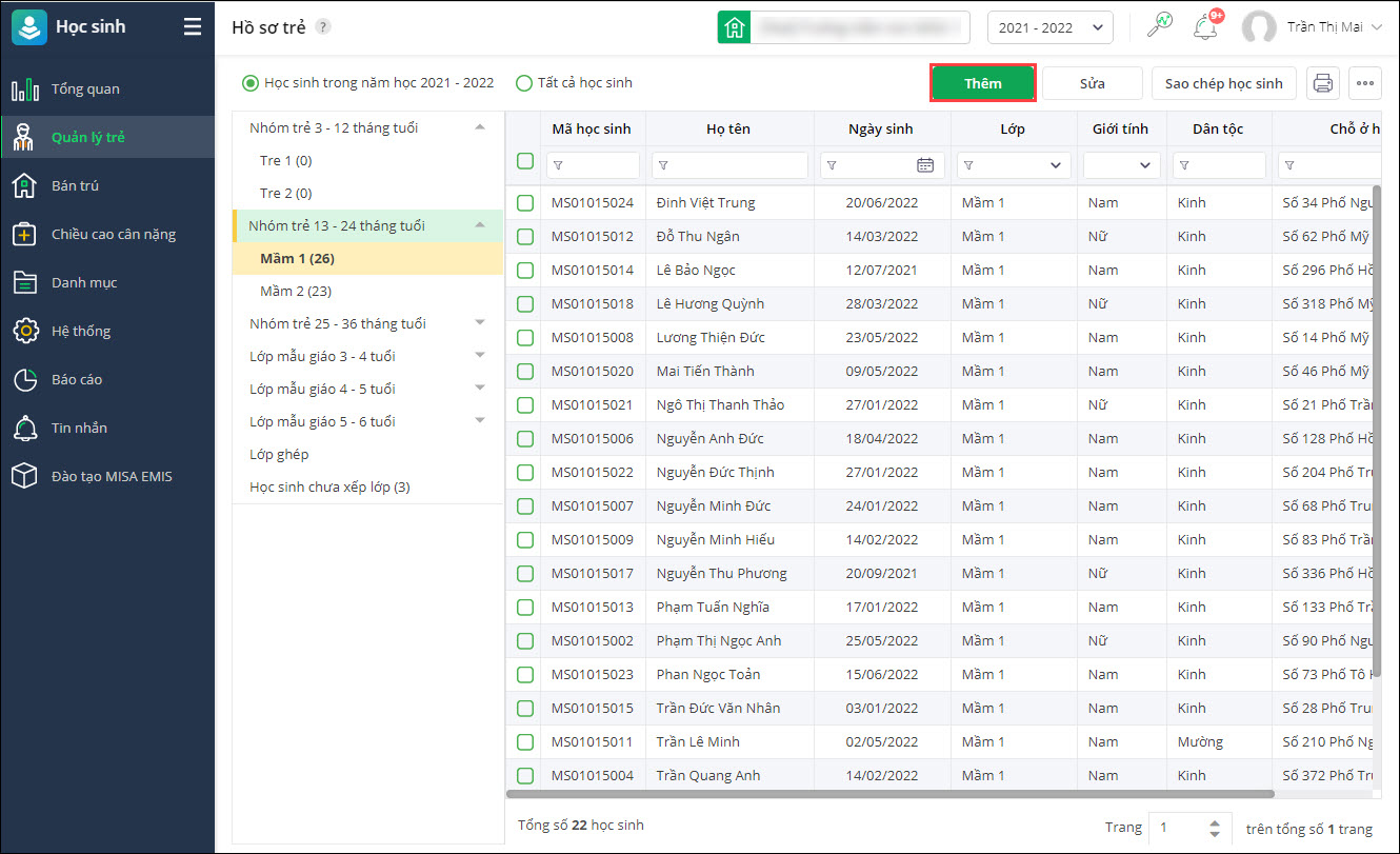 - Tại phân hệ Học sinh\Quản lý trẻ\Hồ sơ trẻ.