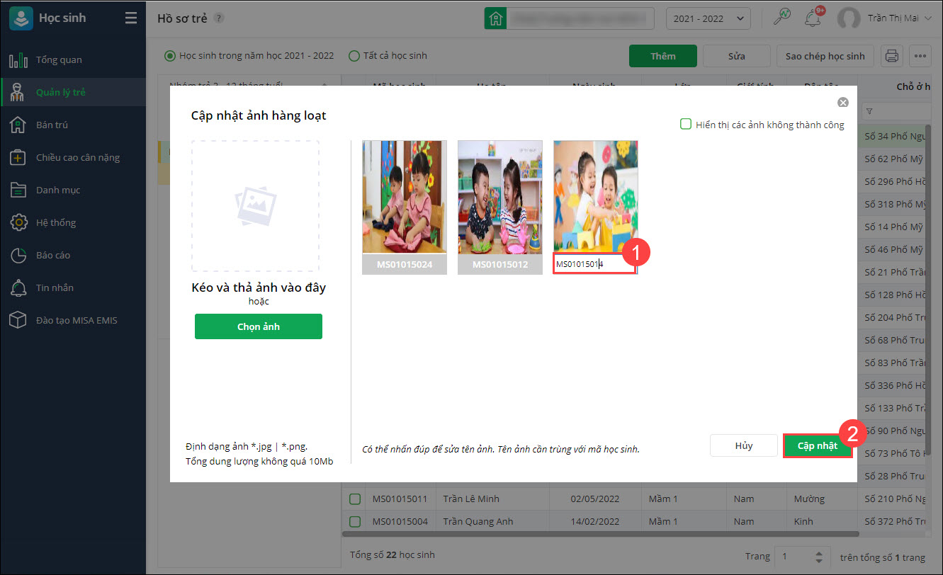 Lưu ý: Để có thể cập nhật ảnh hàng loạt, anh/chị giữ phím Ctrl và lựa chọn các ảnh cần cập nhật. - Tên ảnh cần trùng với mã học sinh, anh/chị chỉnh sửa bằng cách nhấn đúp chuột.