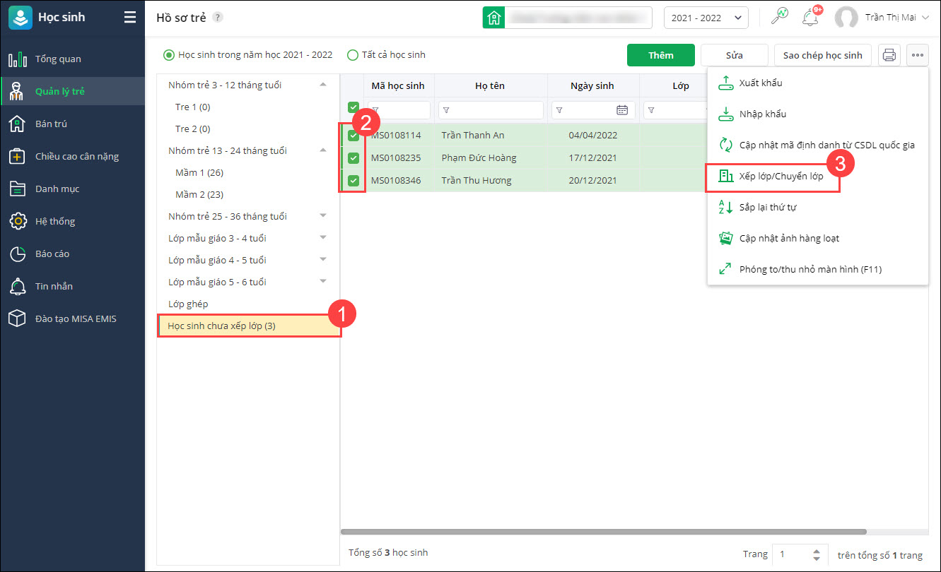 Sau khi thêm mới từng hồ sơ trẻ xong thì anh/chị cần xếp lớp cho học sinh đó:- Tại màn hình Hồ sơ trẻ, chọn Học sinh chưa xếp lớp.