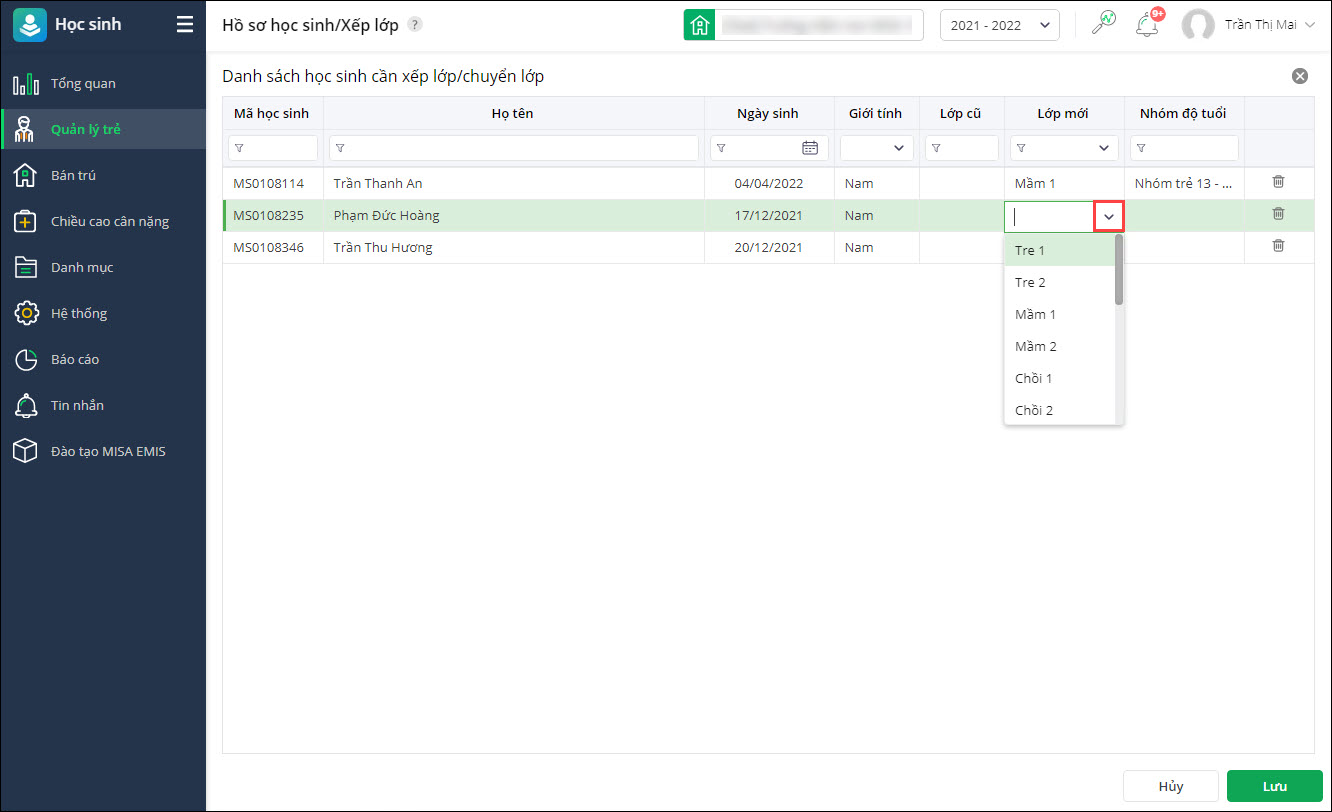 - Chọn Lớp mới cho trẻ, nhấn Lưu.